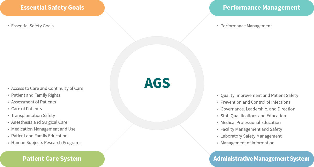 AGS is the goal and performance indicator of Asan Medical Center. Unlike international medical institution accreditation standards, such as JCI, AGS is a year-round evaluation system. The Office for AGS of Asan Medical Center is a dedicated team in the development and revision, application, evaluation, and education of AGS standards. Asan Medical Center continues to reinforce AGS according to changes in the domestic and foreign medical environment and hospital competency development.