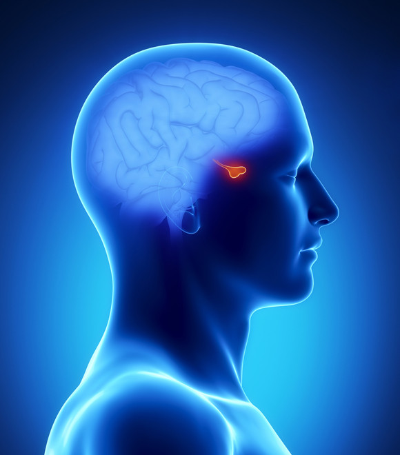 The pituitary gland located in the sella turcica, which resembles a saddle, is anatomically divided into the adenohypophysis (anterior pituitary) and the neurohypophysis (posterior pituitary). It connects to the hypothalamus of the brain which engages in the secretion and control of the hormones in the body. The pituitary gland is also surrounded by the optic nerve, the optic chiasm, the internal carotid artery, the cavernous sinus, and the temporal lobe, leading to various related symptoms if a tumor develops.
